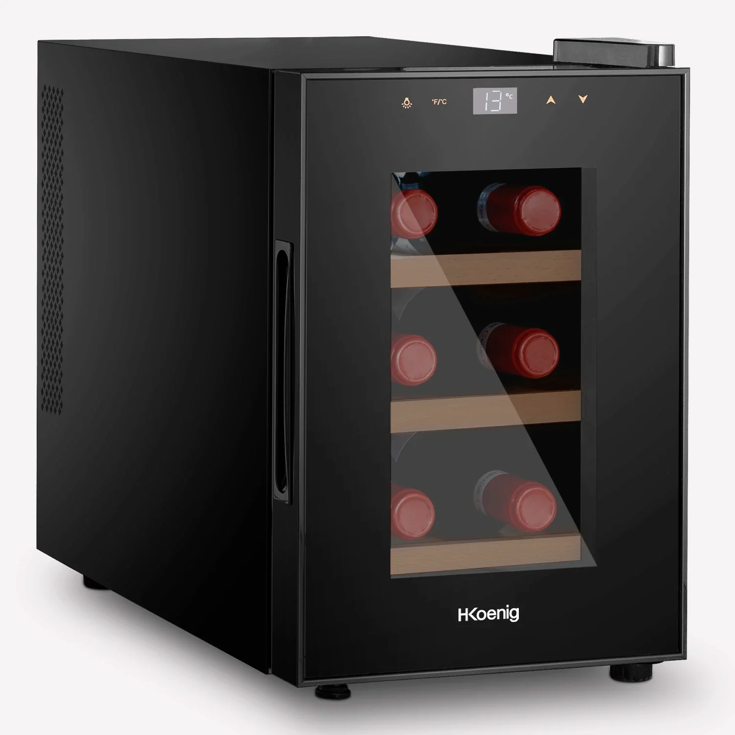 La vinoteca H.Koenig AGE6 es una opción compacta y elegante para conservar hasta 6 botellas de vino a una temperatura ideal de 11°C a 18°C. Equipada con refrigeración termoeléctrica silenciosa y sin vibraciones, puerta de cristal anti-UV, control táctil y luz LED interior, garantiza la mejor conservación del vino en espacios reducidos.